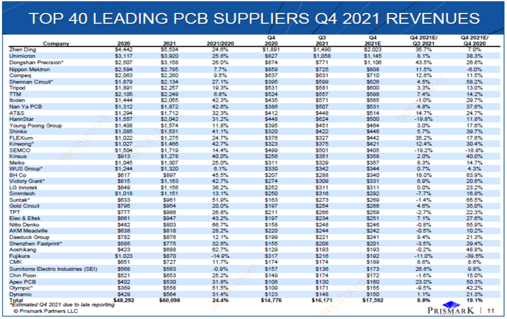 yabo.com科技位列2021年Q4全球40强PCB企业第22名