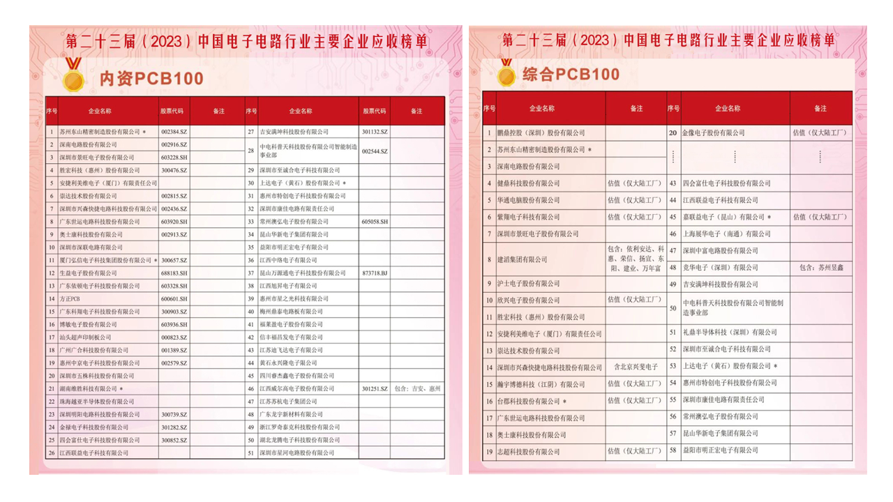 近期,中国电子电路行业协会(CPCA)正式发布了《第二十三届(2023)中国电子电路行业主要企业营收榜单》。yabo.com科技凭借稳健坚韧的市场表现与综合实力荣登2023年度内资PCB百强榜单第4名,同时在综合PCB排名中位列第11名。