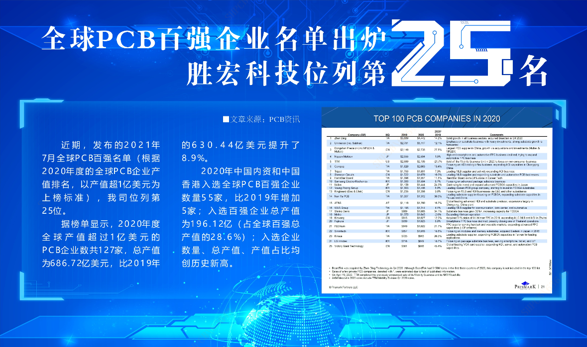 近期,Prismark发布2021年7月全球PCB百强名单(根据2020年度的全球PCB企业产值排名,以产值超1亿美元为上榜标准),我司位列第25位。