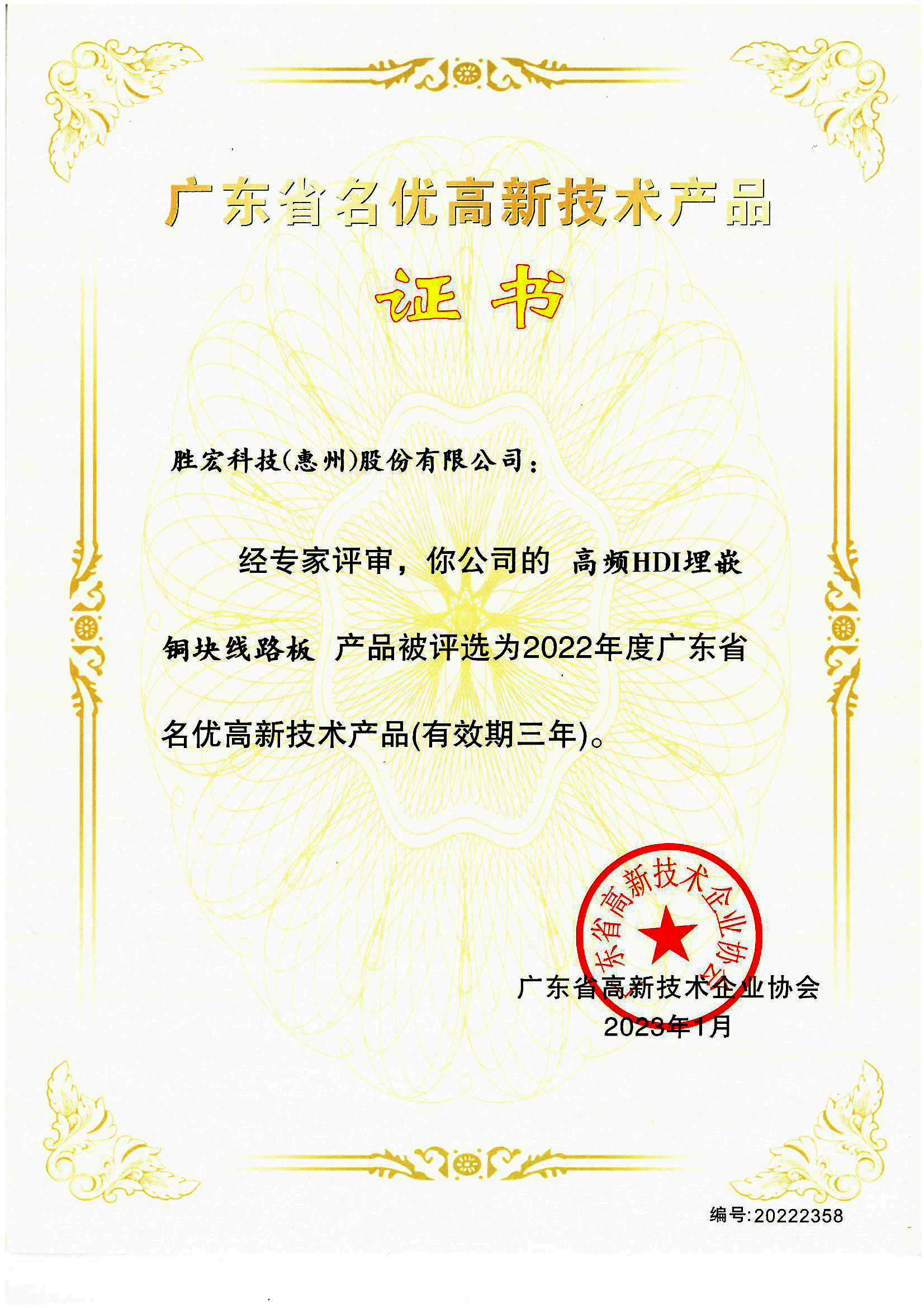 “高端高频电路板”名优高新技术产品证书